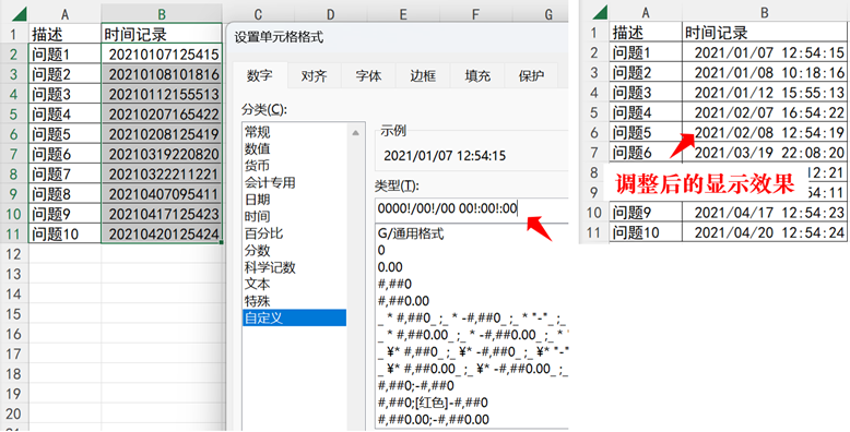 的确,这样的数据非常不利于视觉识别。对B的列的数据,可以通过单元格自定义格式进行调整。选择B2:B11单元格区域,路径:鼠标右键|设置单元格格式|自定义,在格式输入区中,输入0000!/00!/00 00!:00!:00,确定后即可将记录调整为可识别的日期加时间的显示格式。
